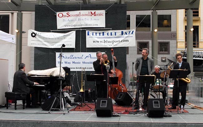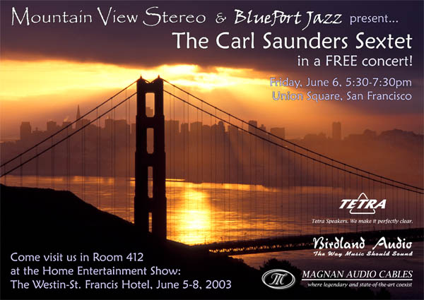 Out of all the shows to date, we am really proud of our presence at HE03 because we had the opportunity to co-sponsor one of the best Jazz sextet in existence today, the Carl Saunders Sextet for a 2 hour free concert on Friday June 6th at 5h30pm at Union Square Park in San-Fransisco. And as always they were great!! From left to right, in the picture above you'll recognize Christian Jacob, possibly one of the top 5 Jazz pianists alive today, Andy Martin at the Trombone, Kevin Axt on Bass, Carl Saunders on Trumpet, the amazing Santo Savino on Drums and Jerry Pinter on Saxophone.